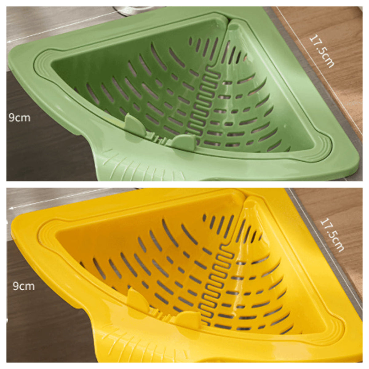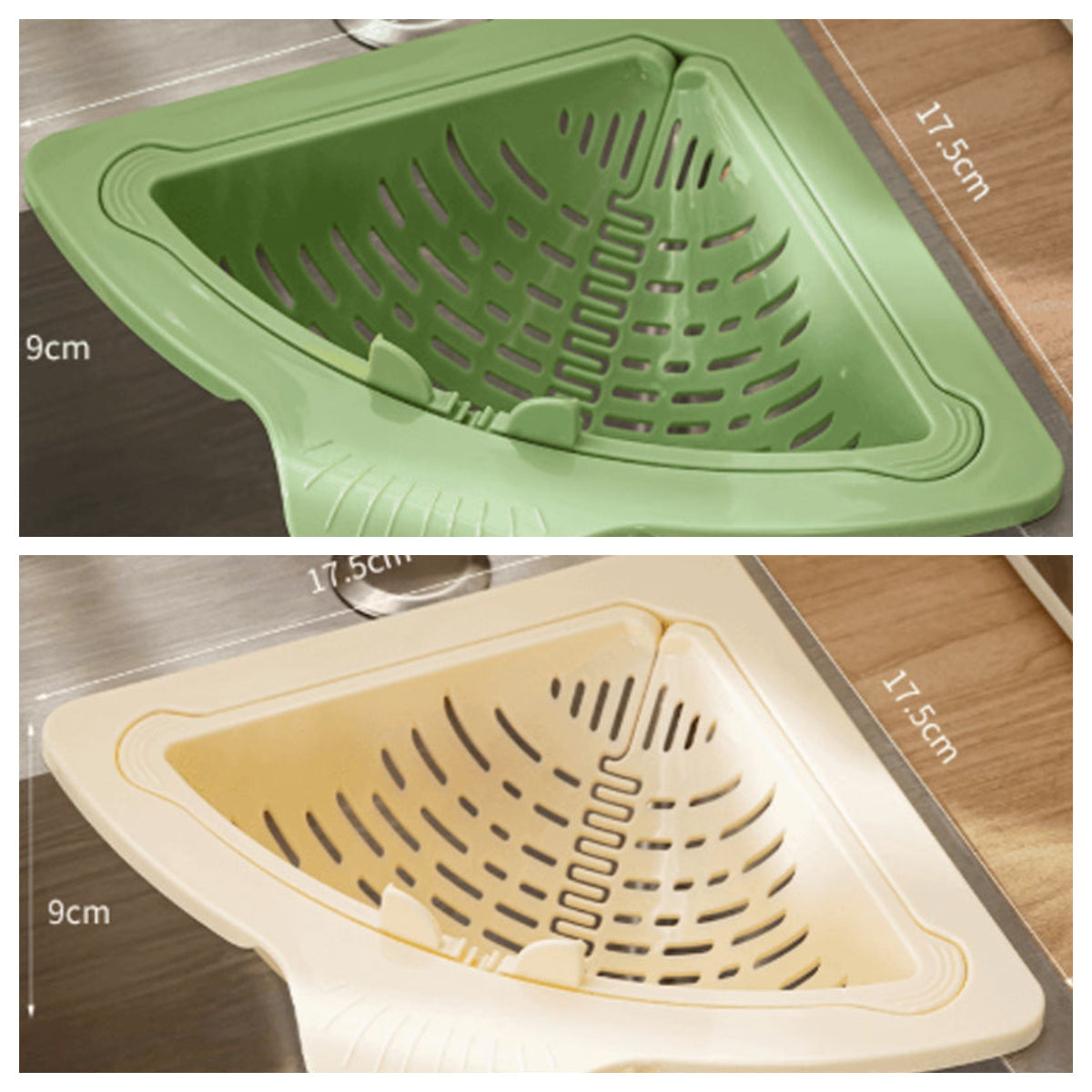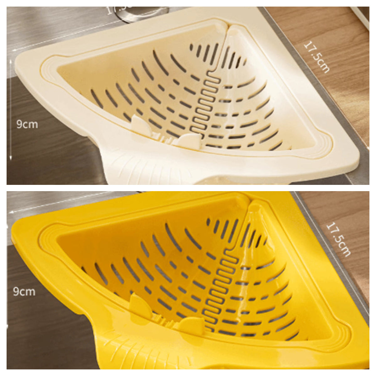 Oszczędność miejsca: Idealnie dopasowuje się do narożnika zlewu, maksymalizując przestrzeń blatu i umywalki. Trójkątny kształt zwiększa praktyczność bez utrudniania korzystania ze zlewu, efektywnie wykorzystując dostępną przestrzeń.