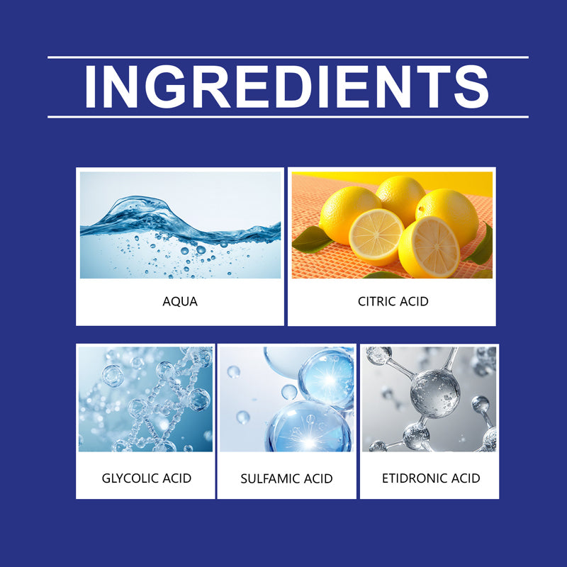 Główne składniki: woda, kwas cytrynowy, kwas aminosulfonowy, kwas glikolowy, kwas hydroksyetylo-difosfonowy