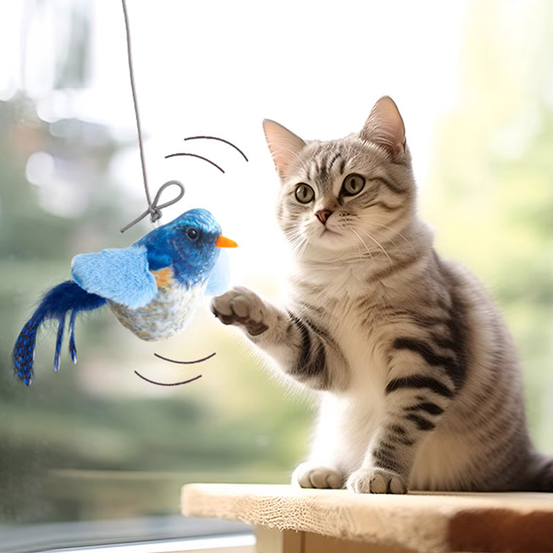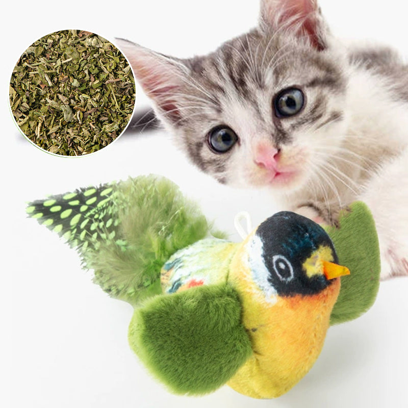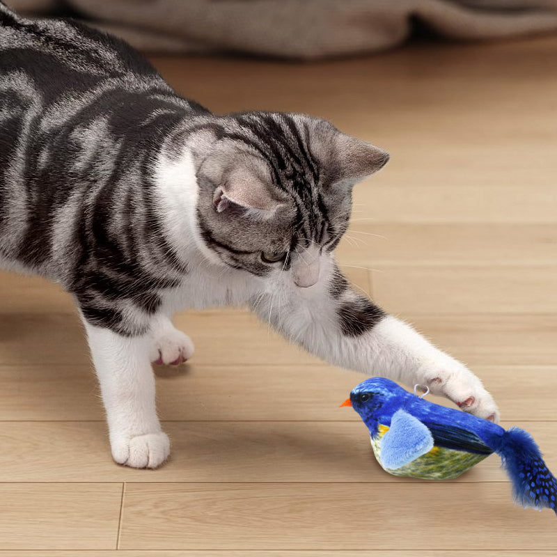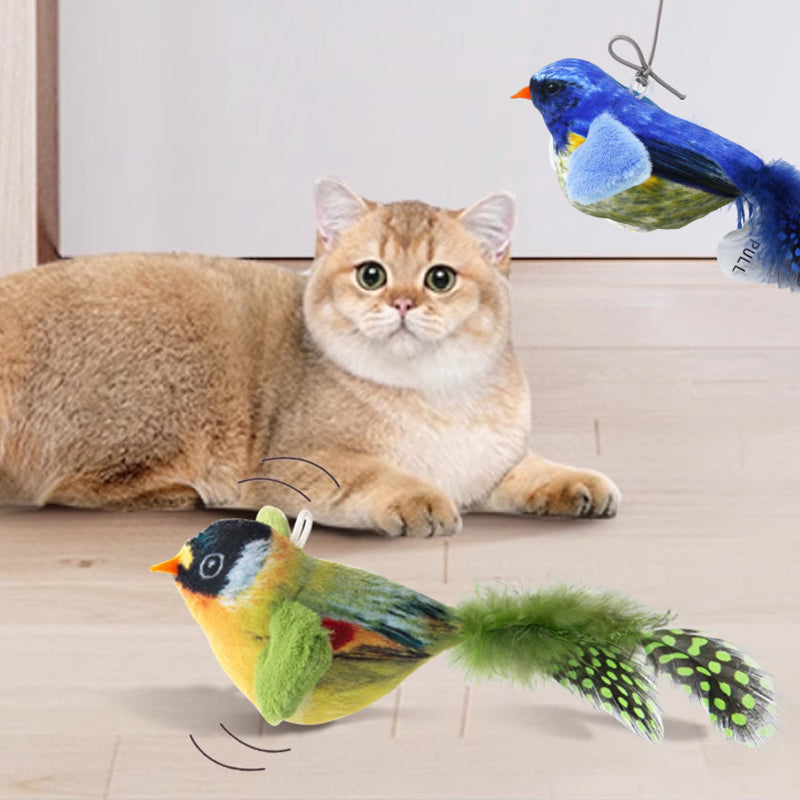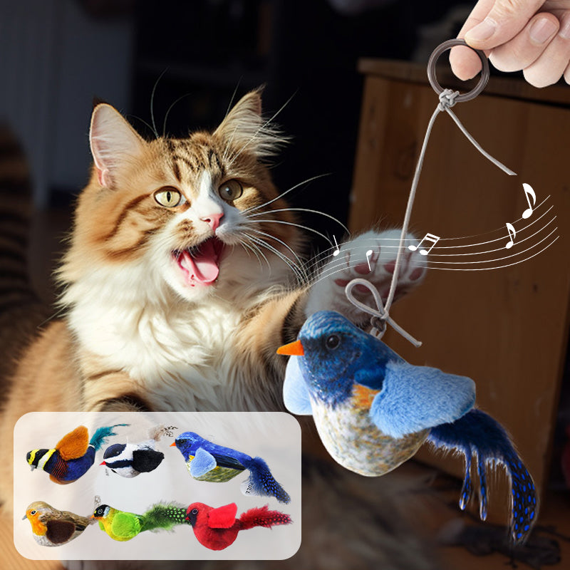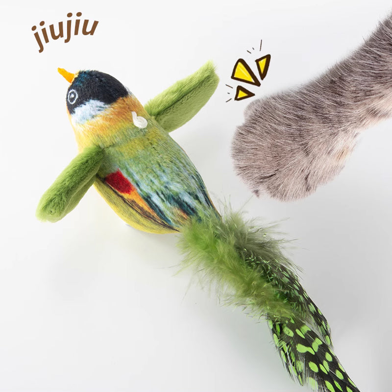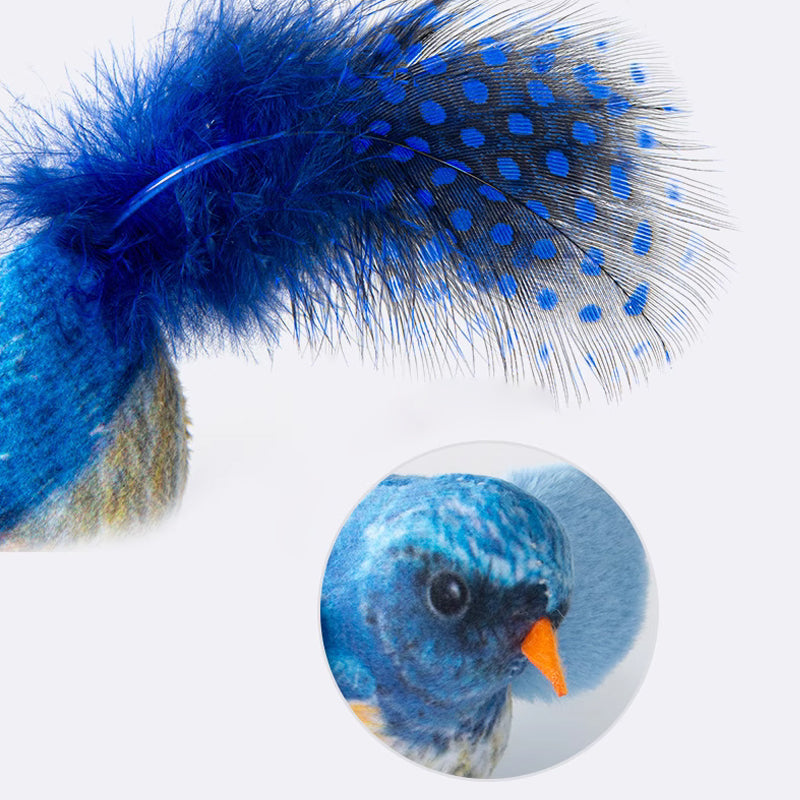 REALISTYCZNE ŚCIEŻKI DŹWIĘKOWE PTAKÓW: Każda pluszowa zabawka zawiera wbudowany moduł dźwiękowy, który odtwarza realistyczne śpiewy i świergot ptaków, za każdym razem zachęcając kota do zabawy w polowanie.