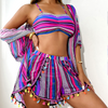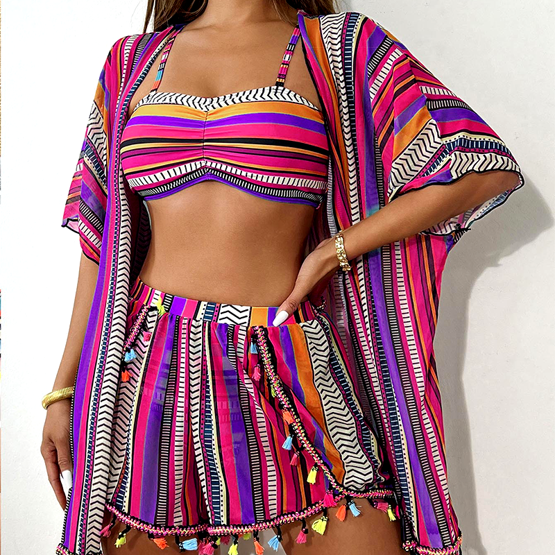 WSZECHSTRONNY ZESTAW 4-CZĘŚCIOWY – Zawiera top bikini, figi, narzutkę plażową oraz szorty, umożliwiając szybką zmianę stylizacji. Idealny na wakacje w kurorcie, imprezy na jachcie czy tropikalne wyjazdy.
