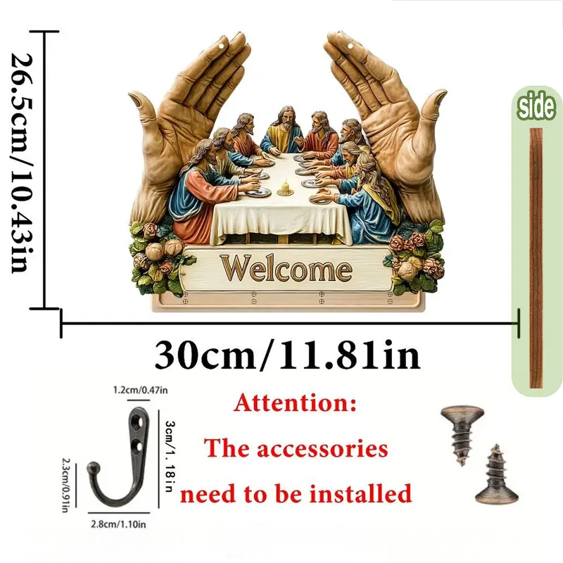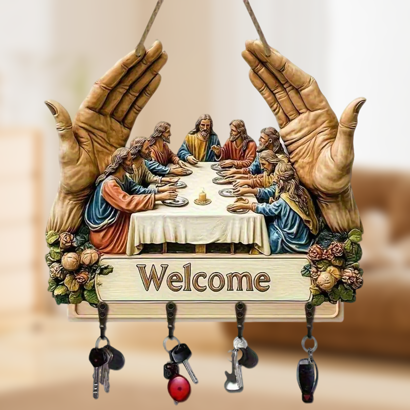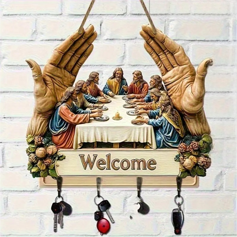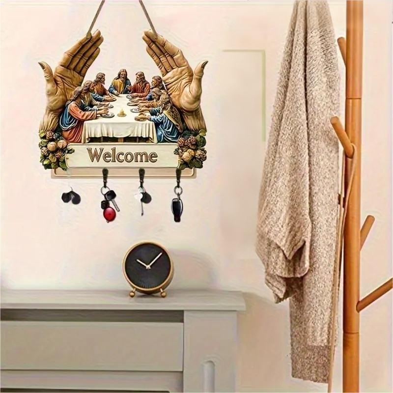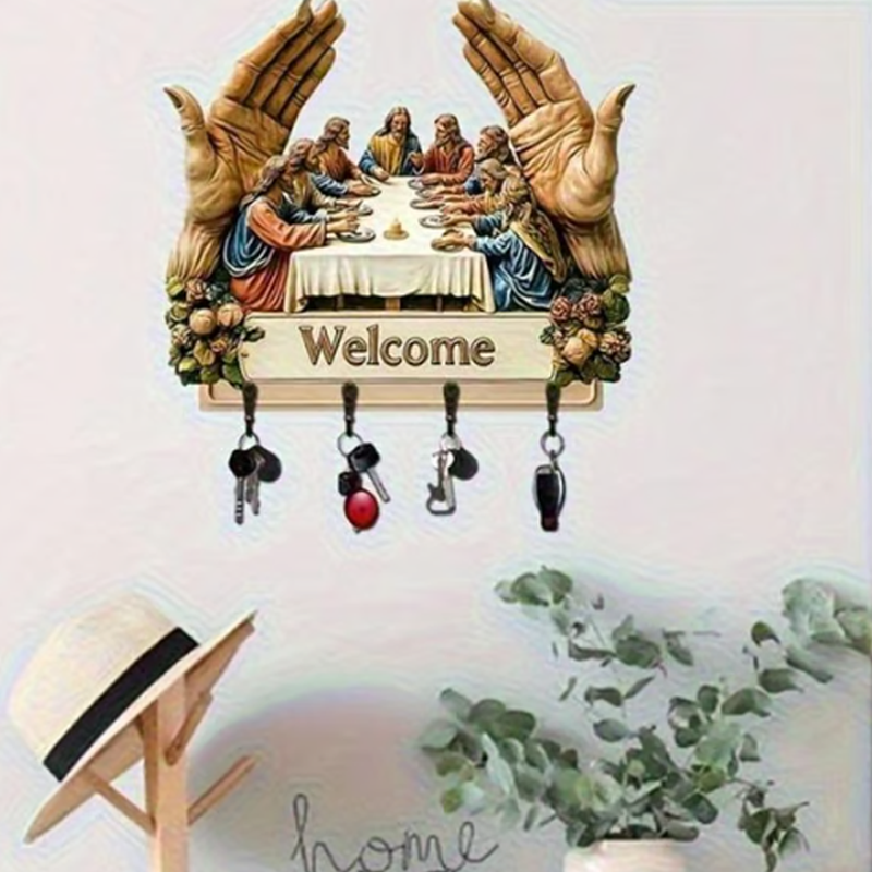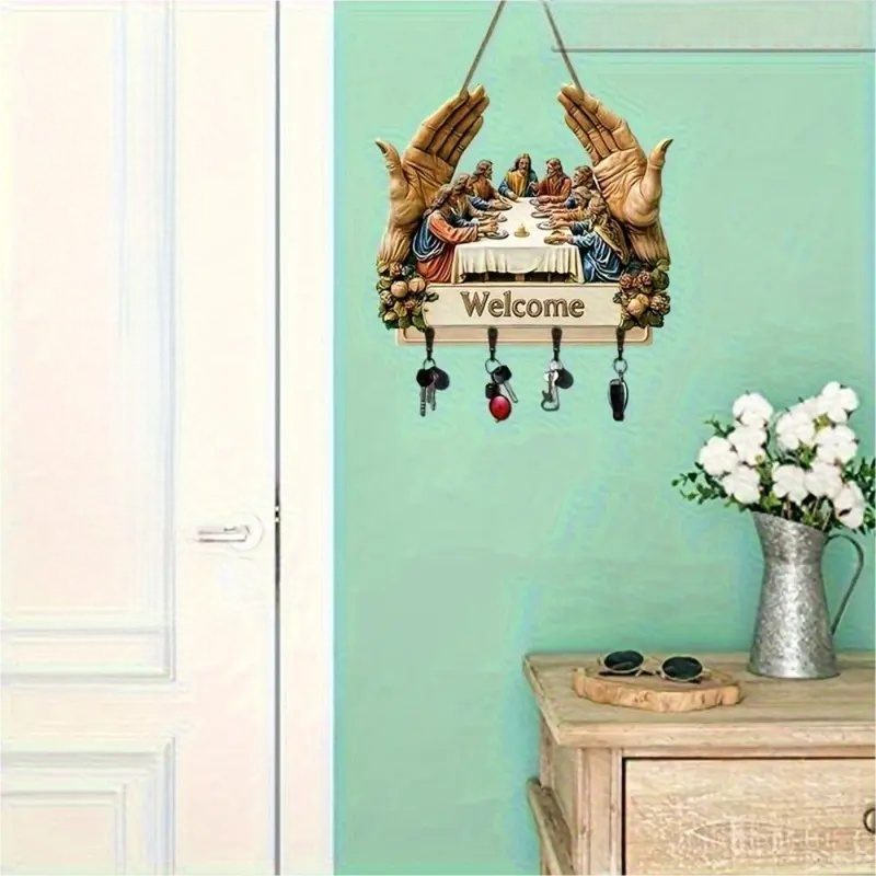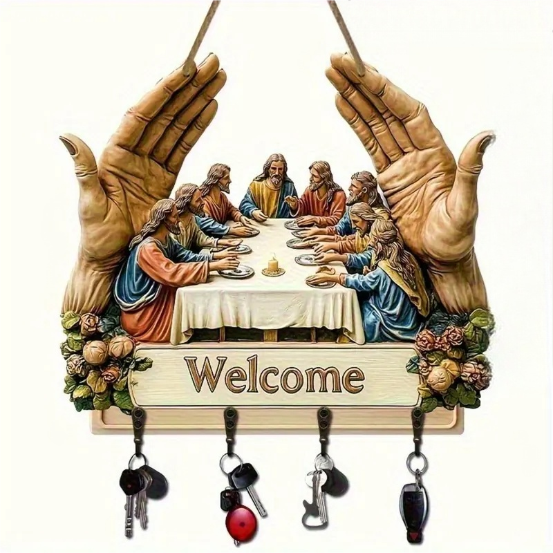 KLASYCZNY WZORNICTWO ARTYSTYCZNE: Ten drewniany wieszak na klucze z kultowym motywem „Ostatniej wieczerzy” wzbogaca wnętrza o ponadczasowe piękno. Jego artystyczny nadruk dodaje elegancji, a jednocześnie łączy dekoracyjność z funkcjonalnością, zmieniając prosty dodatek ścienny w znaczące dzieło sztuki do domu.